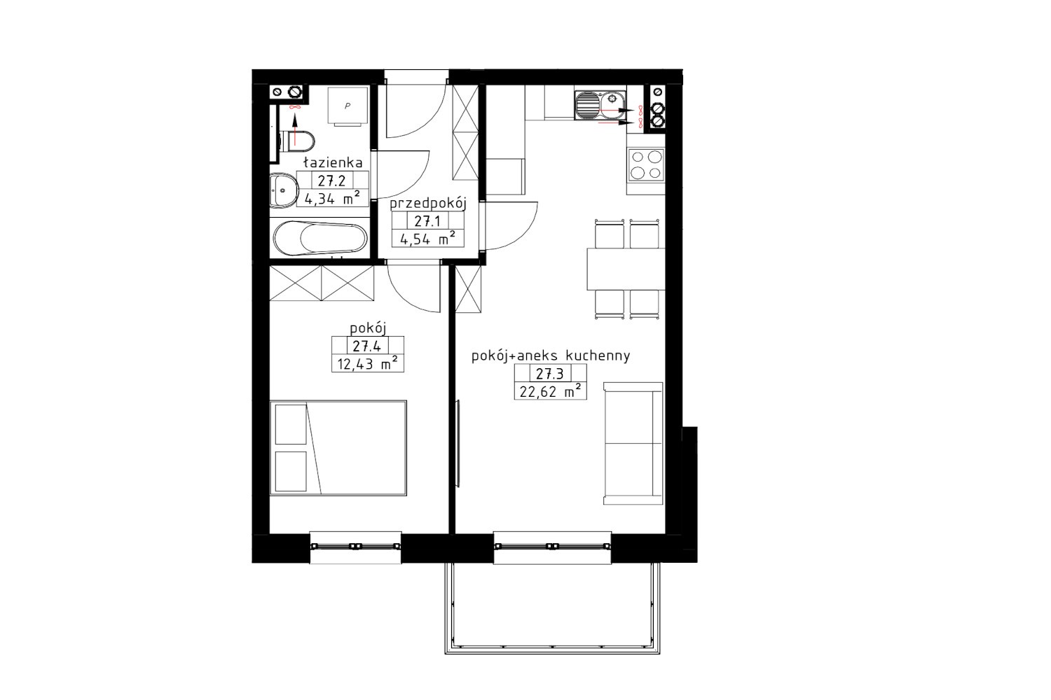 Mieszkanie wykończone pod klucz – gotowe do zamieszkania. Mieszkanie 2- pokojowe numer 27 usytuowane na drugim piętrze. Powierzchnia użytkowa to 43,88 m 2. Składa się z: przedpokoju, pokoju dziennego z aneksem, sypialni, łazienki i balkonu, co zapewnia dodatkową przestrzeń do relaksu i odpoczynku na świeżym powietrzu. Do dyspozycji mieszkańców plac zabaw, na terenie nieruchomości miejsca parkingowe, bliskość punktów handlowych. Ogrzewanie gazowe poprzez własną kotłownię w budynku. Do każdego mieszkania przynależy komórka lokatorska.