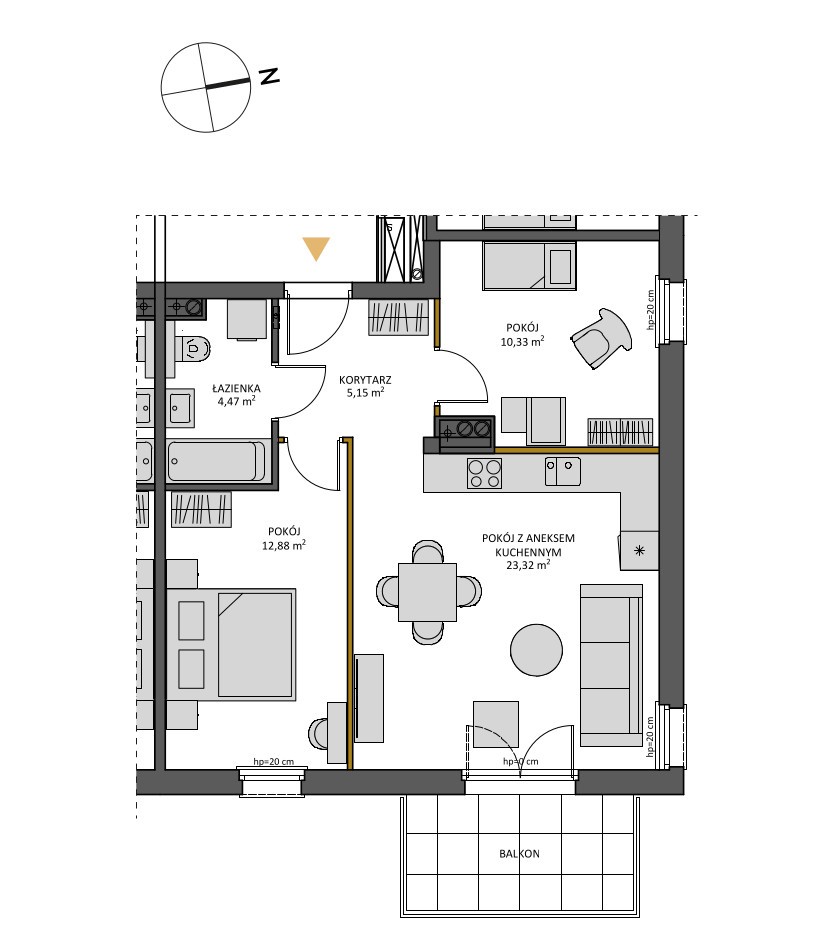 Mieszkanie A1 o powierzchni 56,33 m², składające się z korytarza, pokoju z aneksem kuchennych, pokoju, pokoju, łazienki.