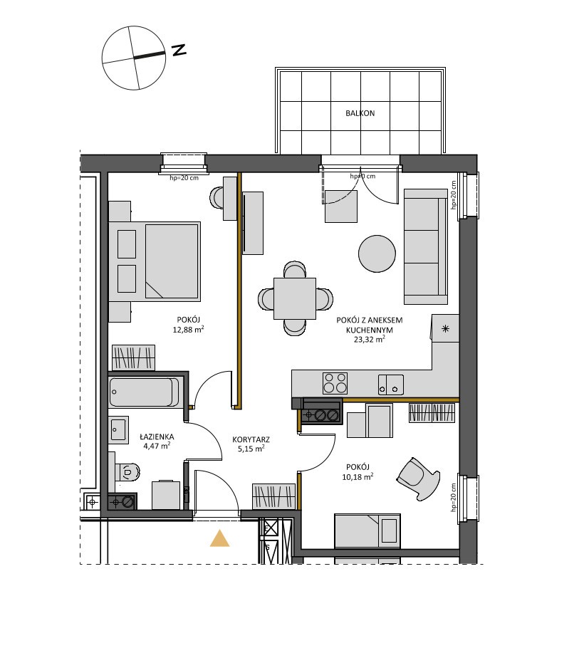 Mieszkanie A17 o powierzchni 56,00 m², składające się z korytarza, pokoju z aneksem kuchennych, pokoju, pokoju, łazienki.