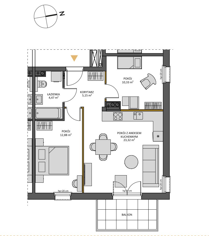 Mieszkanie A2 o powierzchni 56,15 m², składające się z korytarza, pokoju z aneksem kuchennych, pokoju, pokoju, łazienki.