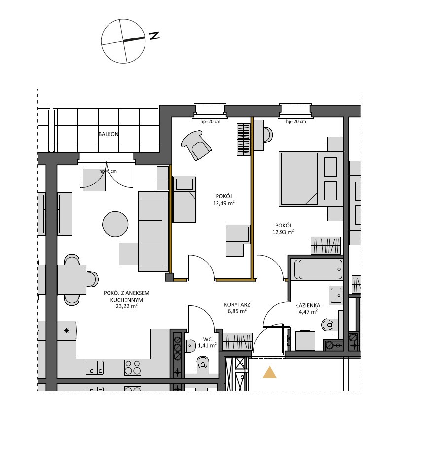 Mieszkanie A22 o powierzchni 61,37 m², składające się z korytarza, pokoju z aneksem kuchennych, pokoju, pokoju, łazienki, wc.