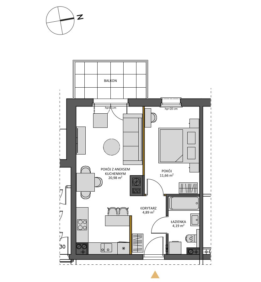 Mieszkanie A24 o powierzchni 41,72 m², składające się z korytarza, pokoju z aneksem kuchennych, pokoju, łazienki.