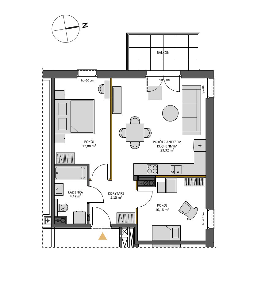 Mieszkanie A25 o powierzchni 56,00 m², składające się z korytarza, pokoju z aneksem kuchennych, pokoju, pokoju, łazienki.