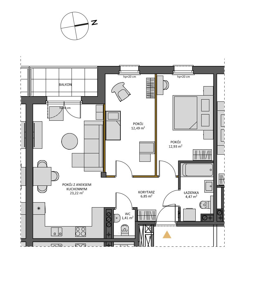 Mieszkanie A30 o powierzchni 61,37 m², składające się z korytarza, pokoju z aneksem kuchennych, pokoju, pokoju, łazienki, wc.