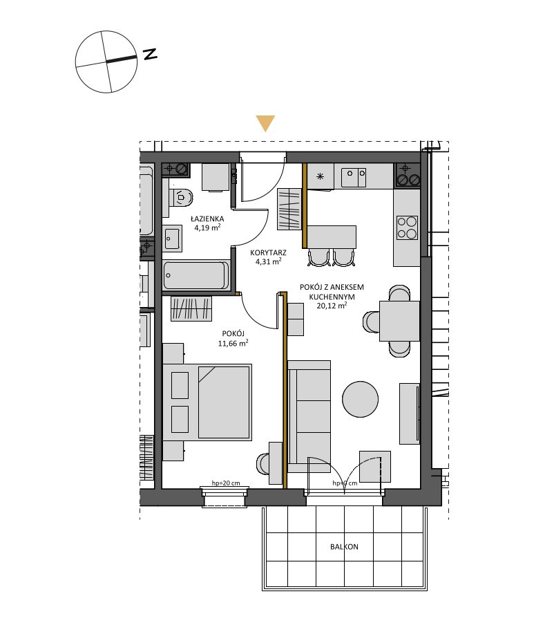 Mieszkanie A43 o powierzchni 40,28 m², składające się z korytarza, pokoju z aneksem kuchennych, pokoju, łazienki.