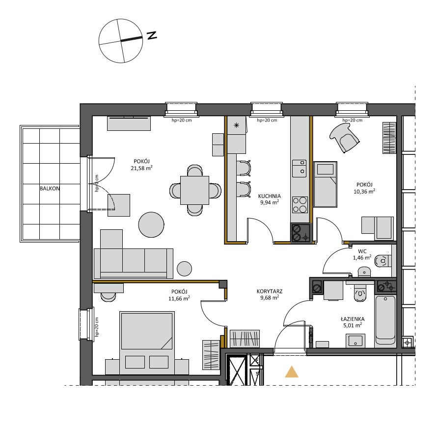 Mieszkanie A53 o powierzchni 69,69 m², składające się z korytarza, kuchni, pokoju, pokoju, pokoju, łazienki, wc.