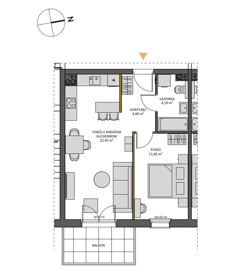 Mieszkanie A58 o powierzchni 43,19 m², składające się z korytarza, pokoju z aneksem kuchennym, pokoju, łazienki.
