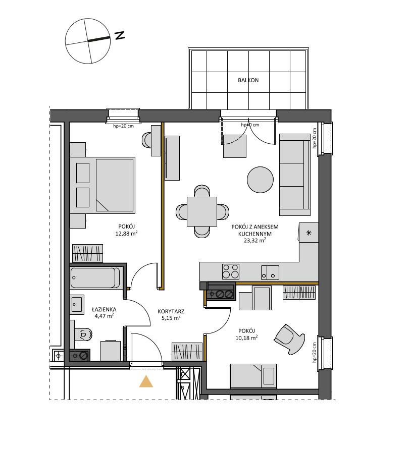 Mieszkanie A9 o powierzchni 56,00 m², składające się z korytarza, pokoju z aneksem kuchennych, pokoju, pokoju, łazienki.