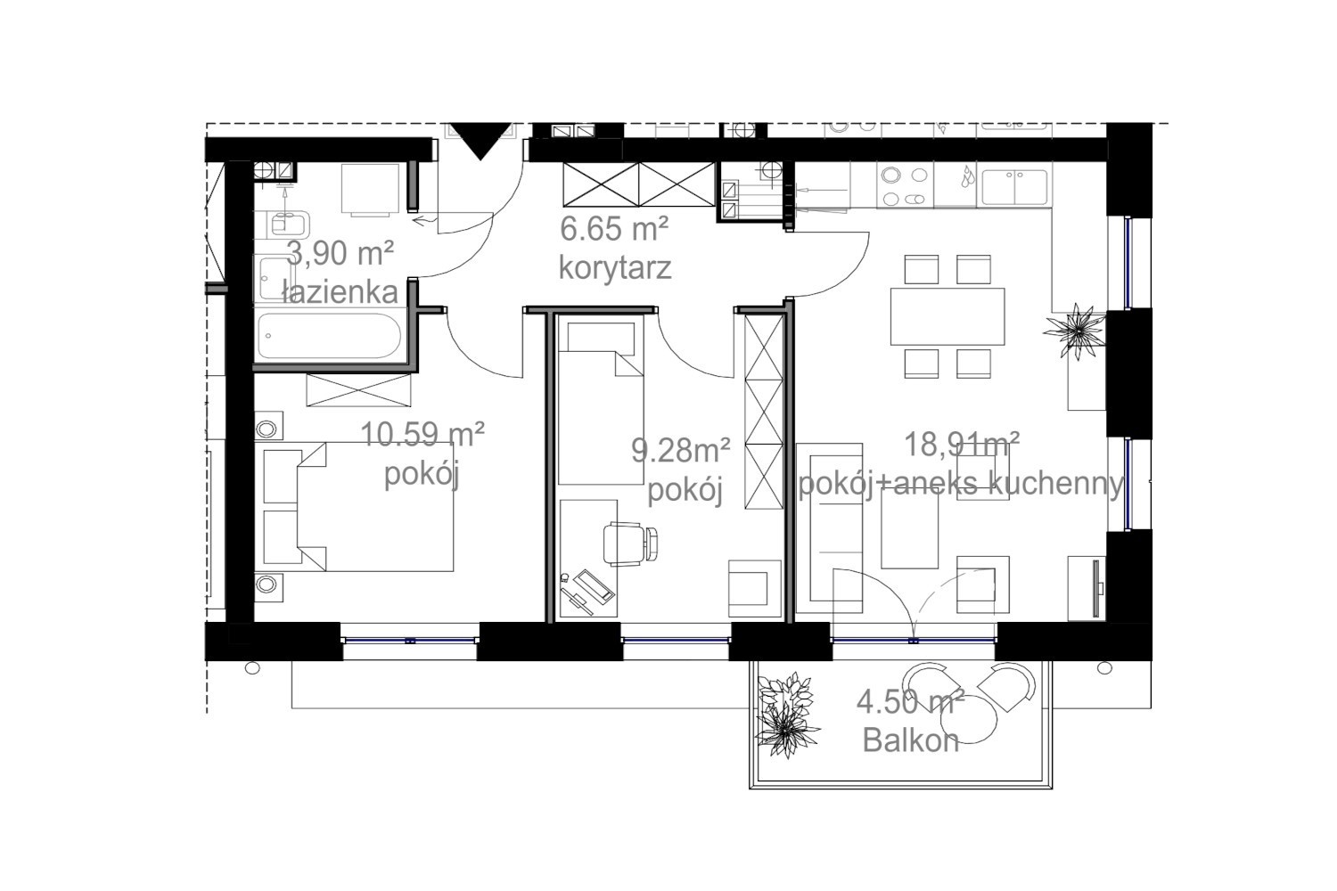 Komfortowe 3 pokojowe mieszkanie numer 22 usytuowane na I piętrze segmentu A. Powierzchna użytkowa to 49,33 m kw. Składa się z: przedpokoju, pokoju dziennego z aneksem, dwóch sypialni i łazienki i balkonu. Mieszkanie w stanie deweloperskim do własnej aranżacji. Do dyspozycji mieszkańców komfortowa cichobieżna winda, zewnętrzny ogrodzony plac zabaw, parking naziemny. Ogrzewanie gazowe poprzez własną kotłownie. Do mieszkania przynależy komórka lokatorska w cenie mieszkania. Możliwość zakupu indywidualnego garażu.