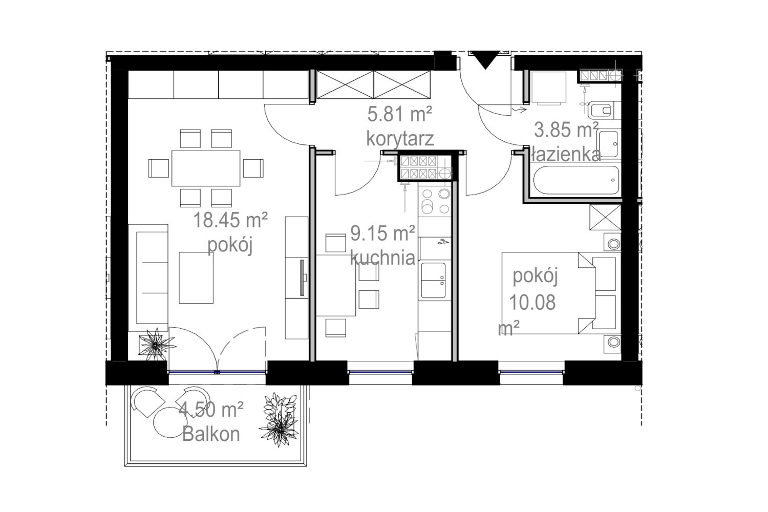Komfortowe 2 pokojowe mieszkanie numer 51 usytuowane na III piętrze segmentu B. Powierzchnia użytkowa to 47,34 m kw. Składa się z: przedpokoju, pokoju dziennego, kuchni, sypialni, łazienki i balkonu. Mieszkanie w stanie deweloperskim do własnej aranżacji. Do dyspozycji mieszkańców komfortowa cichobieżna winda, zewnętrzny ogrodzony plac zabaw, parking naziemny. Ogrzewanie gazowe poprzez własną kotłownie. Do mieszkania przynależy komórka lokatorska w cenie mieszkania. Możliwość zakupu indywidualnego garażu.