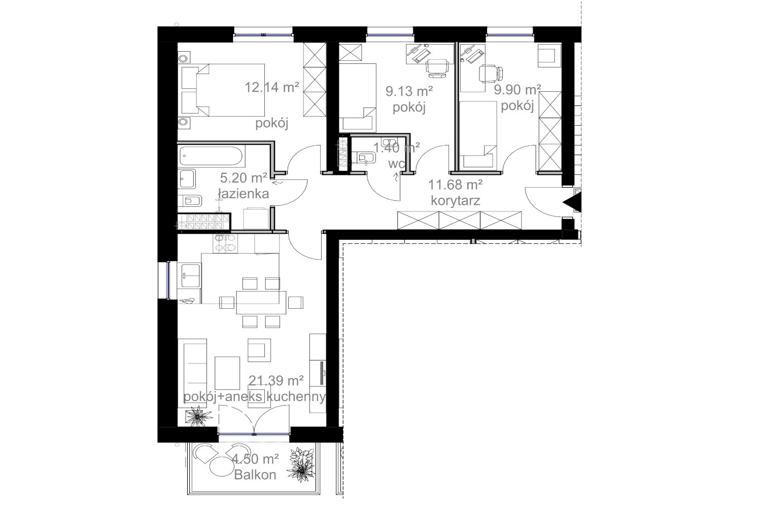 Komfortowe 4 pokojowe mieszkanie numer 52 usytuowane na III piętrze segmentu B. Powierzchnia użytkowa to 70,83 m kw. Składa się z: przedpokoju, pokoju z aneksem, trzech sypialni, łazienki i balkonu. Mieszkanie w stanie deweloperskim do własnej aranżacji.