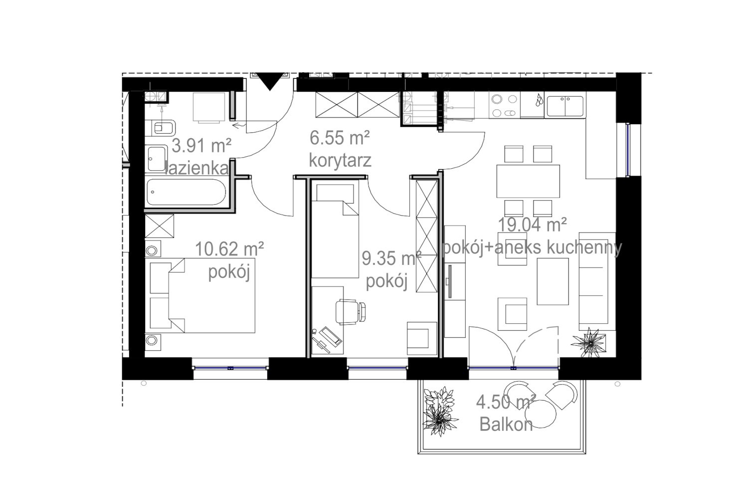 Komfortowe 3 pokojowe mieszkanie numer 59 usytuowane na I piętrze segmentu B. Powierzchnia użytkowa to 49,47 m kw. Składa się z: przedpokoju, pokoju dziennego z aneksem, dwóch sypialni i łazienki i balkonu. Mieszkanie w stanie deweloperskim do własnej aranżacji. Do dyspozycji mieszkańców komfortowa cichobieżna winda, zewnętrzny ogrodzony plac zabaw, parking naziemny. Ogrzewanie gazowe poprzez własną kotłownie. Do mieszkania przynależy komórka lokatorska w cenie mieszkania. Możliwość zakupu indywidualnego garażu.
