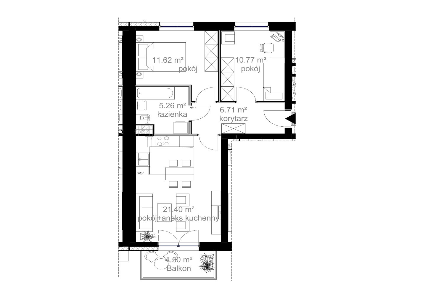 Komfortowe 3 pokojowe mieszkanie numer 62 usytuowane na I piętrze segmentu B. Powierzchnia użytkowa to 55,76 m kw. Składa się z: przedpokoju, pokoju dziennego z aneksem, dwóch sypialni i łazienki i balkonu. Mieszkanie w stanie deweloperskim do własnej aranżacji. Do dyspozycji mieszkańców komfortowa cichobieżna winda, zewnętrzny ogrodzony plac zabaw, parking naziemny. Ogrzewanie gazowe poprzez własną kotłownie. Do mieszkania przynależy komórka lokatorska w cenie mieszkania. Możliwość zakupu indywidualnego garażu