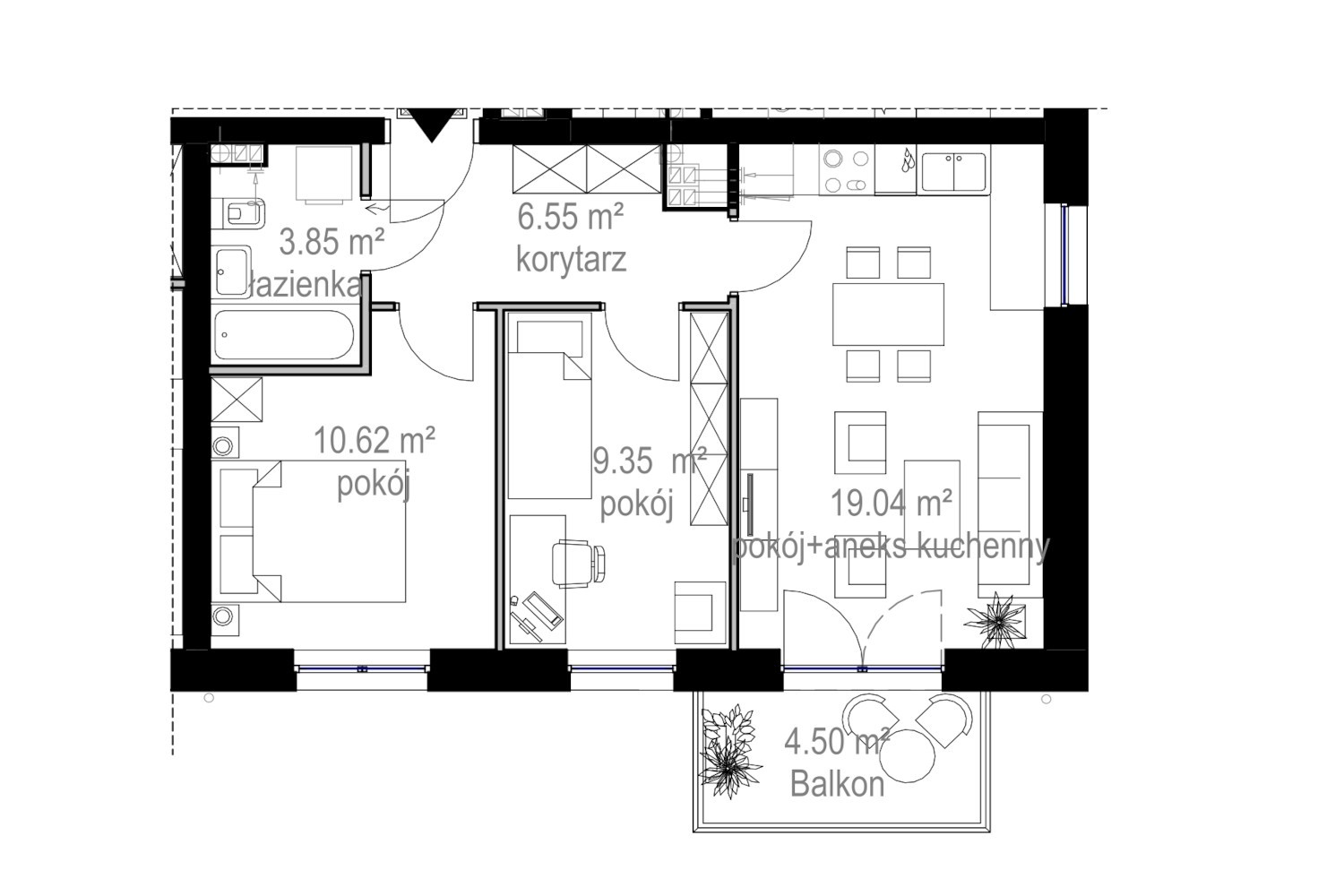 Komfortowe 3 pokojowe mieszkanie numer 64 usytuowane na II piętrze segmentu B. Powierzchnia użytkowa to 49,41 m kw. Składa się z: przedpokoju, pokoju dziennego z aneksem, dwóch sypialni, łazienki i balkonu. Mieszkanie w stanie deweloperskim do własnej aranżacji. Do dyspozycji mieszkańców komfortowa cichobieżna winda, zewnętrzny ogrodzony plac zabaw, parking naziemny. Ogrzewanie gazowe poprzez własną kotłownie. Do mieszkania przynależy komórka lokatorska w cenie mieszkania. Możliwość zakupu indywidualnego garażu.