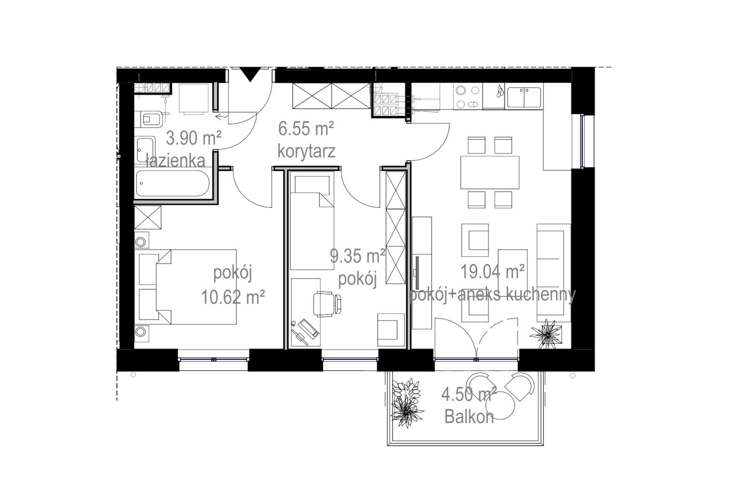 Komfortowe 3 pokojowe mieszkanie numer 69 usytuowane na III piętrze segmentu B. Powierzchnia użytkowa to 49,46 m kw. Składa się z: przedpokoju, pokoju dziennego z aneksem, dwóch sypialni i łazienki i balkonu. Mieszkanie w stanie deweloperskim do własnej aranżacji. Do dyspozycji mieszkańców komfortowa cichobieżna winda, zewnętrzny ogrodzony plac zabaw, parking naziemny. Ogrzewanie gazowe poprzez własną kotłownie. Do mieszkania przynależy komórka lokatorska w cenie mieszkania. Możliwość zakupu indywidualnego garażu.