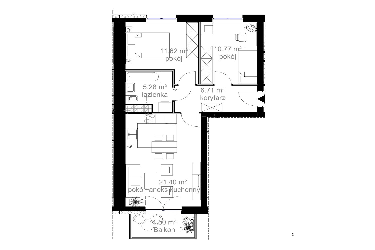 Komfortowe 3 pokojowe mieszkanie numer 72 usytuowane na III piętrze segmentu B. Powierzchnia użytkowa to 55,78 m kw. Składa się z: przedpokoju, pokoju dziennego z aneksem, dwóch sypialni i łazienki i balkonu. Mieszkanie w stanie deweloperskim do własnej aranżacji. Do dyspozycji mieszkańców komfortowa cichobieżna winda, zewnętrzny ogrodzony plac zabaw, parking naziemny. Ogrzewanie gazowe poprzez własną kotłownie. Do mieszkania przynależy komórka lokatorska w cenie mieszkania. Możliwość zakupu indywidualnego garażu.
